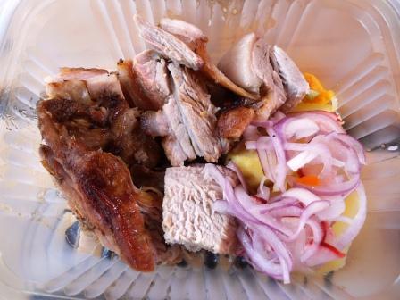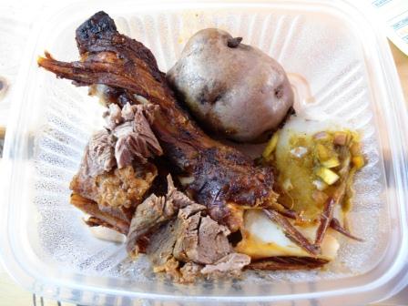 Mientras me quedaba en la cola para el chancho, Joanna aprovechó y fue por el Cordero al Horno del Kankacho Ayavireño que también estaba en nuestra lista. Qué les puedo decir, uno de los mejores platos, súper sencillo, una carne blanda, para comer sólo con tenedor y sin ese fuerte sabor que a veces tiene el cordero. Servido acompañado de papa sancochada, chuño y una salsa de ají. Lo único que de verdad no nos gustó fue el chuño, pero lo demás delicioso.