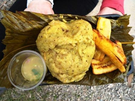 Luego del descanso prolongado y ante la alegría de tener un estómago nuevo en el grupo nos fuimos por la comida de la selva. Habían unos Juanes increíblemente buenos, servidos en hoja plátano y acompañado con deliciosos plátanos fritos. Y no podía faltar el Tacacho con Cecina, con ese sabor ahumado de la carne, pura carne, sin grasa. Nada mal para ir despidiéndonos.