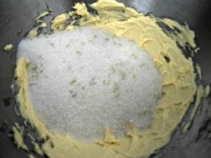 Batir la mantequilla hasta que esté cremosa y agregar el azúcar saborizada con limón. Batir bien hasta que vean que todo se ha unido y el color del batido esté más claro.