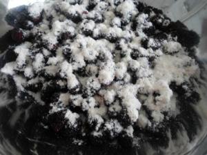 Lo primero que tienen que hacer es treparse a un árbol de moras y sacar unas 3 tazas de ellas…ja,ja,ja…Ya, en un tazón van a mezclar el azúcar con la ralladura de limón. Hagan esto con los dedos, sobando bien el azúcar con el limón para que este último suelte sus aceites y perfume el azúcar.