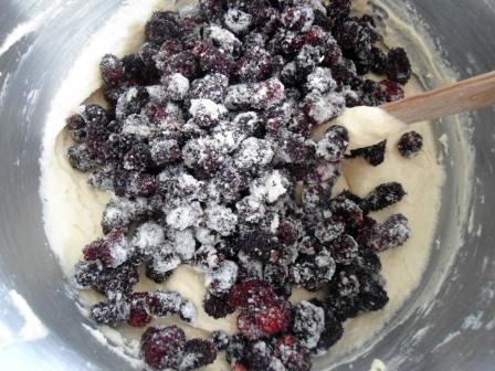 Fuera de la batidora, agregar las moras con toda la harina que haya quedado en el tazón y mezclar suavemente con una espátula de goma. Hacer poco movimiento, sólo el necesario para integrar la fruta.
