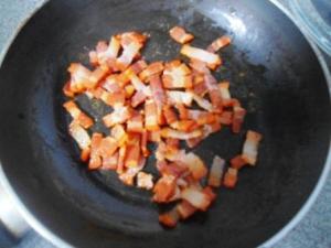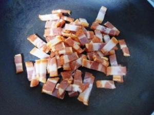 No cocinen mucho el tocino, no debe quedar muy crocante. Una vez listo, retirarlo de la sartén, pero quedarse con la grasa porque la usaremos para el aderezo.
