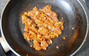 Se fríe la cebolla hasta que esté media dorada, agregar ajo bien picado (o molido) y pasta de tomate y cocinar hasta que casi caramelice. Sazonar con sal y pimienta.