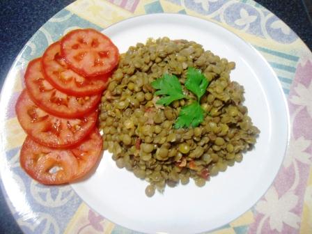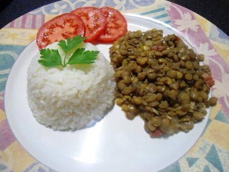 La forma como comemos las lentejas es guisada y aunque no lo crean, servida con arroz, y es que en Perú todo lo comemos con arroz, no importa si es harina con harina, los platos SIEMPRE con arroz, por lo general blanco y si es posible preparado con ajo. Yo soy de las pocas personas que no come mucho arroz, así que prefiero servirme las lentejas con ensalada fresca, nada de complicaciones, unas buenas rodajas de tomate aliñadas con sal y limón es para mí una ensalada perfecta.