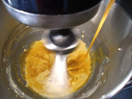 Luego agregar la harina cernida con el polvo de hornear. Hacer esto a velocidad baja en la batidora o de lo contrario fuera de ella y mezclando con una espátula.