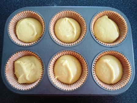 Repartir la masa en los moldes de cupcakes a los cuales les hemos puesto los pirotines especiales para horno. Con la receta que les voy a dar salen 7 cupcakes, sí, no es mucho, así que es ideal para cuando quieren hacer poca cantidad.