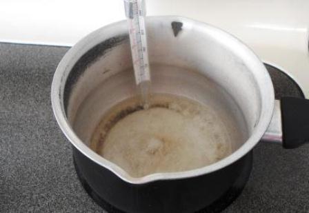 Mientras se van horneando los cupcakes hay que preparar el almíbar. Entonces, en una olla colocar el azúcar, agua y Pisco. Sí lo hice con Pisco, para darle más sabor peruano…!!! Llevar a ebullición hasta lograr los 210°F/100°C, es cuando el azúcar está totalmente disuelta y la mezcla está aún líquida. Retirar del calor y dejar que se vaya enfriando mientras terminan de hornear los cupcakes.
