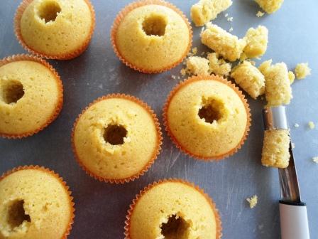 Ahora, con ayuda de ese aparato para retirar el corazón de las manzanas, retirar el centro de cada cupcake. Hacen igual como hacen con las manzanas, insertan el aparato, presionan para abajo y luego lo retiran girándolo un poco. Verán que sale perfectamente todo el centro sin malograr el cupcake. Todavía no se vayan a comer lo que retiren…!!!