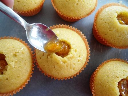 Bien, ahora, con ayuda de una cucharita van a rellenar cada hueco con la mermelada de aguaymanto. Traten re rellenar hasta el tope, presionando un poco la fruta para que el cupcake quede bien relleno.