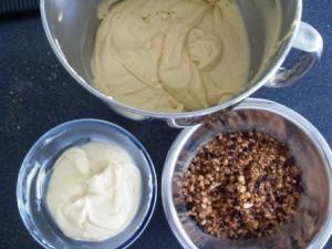 Ahora tenemos entonces tres componentes con los cuales armaremos nuestro queque: el crocante de nibs, la mezcla de queso crema y la masa de queque.