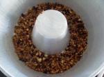 Vamos a empezar por la parte crocante de este queque. Hay que procesar las almendras (o cualquier otra nuez) con el azúcar rubia (morena), canela, nuez moscada, sal y mantequilla derretida. Procesen hasta que vean que quedan trozos pequeños, no las vayan a pulverizar. Luego las pasan a un tazón y recién ahí las mezclan con los nibs de cacao. Los nibs NO se procesan con las almendras. Yamile, ya sé que no te gustaron los nibs porque son amargos, así que si quieres usa sólo las almendras.