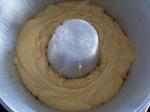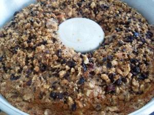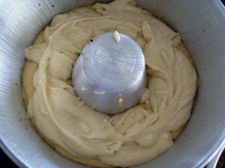 Antes que nada, engrasar un molde de esos lisos con hueco, no les digo de bundt cake porque la verdad creo que no quedaría bien, aunque la receta original dice que lo pueden usar. En fin, colocan en la base la mitad del crocante de nibs, luego ponen la mitad de la masa de queque, luego con cuidado colocan la mezcla de queso, de modo que quede bien en el centro, cubren con el resto de masa y al final ponen el resto del crocante de nibs. Ya está.