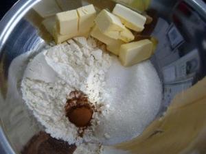 El segundo paso es hacer el crumble o crocante, para eso deberán poner en un tazón la harina, azúcar, canela y mantequilla en cuadritos. La receta lleva además avena, pero como no tenía, no se la puse.