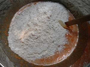 Cernir la harina con el bicarbonato, polvo de hornear, sal y especias y agregar a la mezcla de zanahoria. Mezclar sólo hasta integrar.