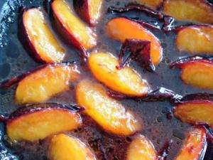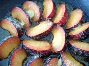 En una sartén derretir la mantequilla, colocar las ciruelas y espolvorear con el azúcar rubia. No hay que cocinarlas mucho, basta un par de minutos por cada lado. Si sus ciruelas están muy blandas, entonces solo una pasadita. La idea es que se ablanden un poco, no que se hagan puré.