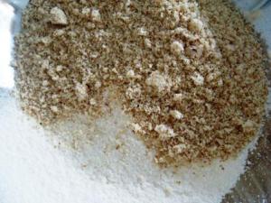 En un tazón cernir la harina con el polvo de hornear, bicarbonato y sal. Agregar la harina de almendras y mezclar. Como ven mi «harina» de almendras está algo oscura, eso es porque me dio mucha flojera pelar mis almendras, así que las procesé con todo y cáscara. Si ustedes prefieren pelarlas antes, aquí tienen una explicación de cómo hacerlo.