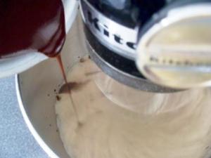 Sin dejar de batir agregar la vainilla y el chocolate derretido. Aquí el gran batido que hicieron con el huevo se les va a bajar, pero supongo que así debe ser, a menos que ya no usen la batidora y hagan la mezcla a mano. Yo lo hice de esta forma porque la receta dice que hay que agregar estos ingredientes sin dejar de batir.