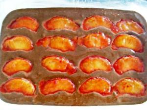 Vaciar la masa dentro de un molde engrasado y enharinado y acomodar sobre la masa los gajos de ciruelas, que a estas alturas ya no están calientes.