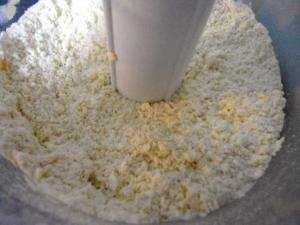 Sin detener el procesador, agregar el agua bien fría y dejar funcionando hasta que se forme la masa. Si se hace a mano, entonces hacen un hueco en medio de la masa, agregan el agua y amasan hasta obtener una masa suave.