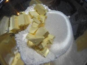 Para la masa que irá en la base del molde, deberán procesar la harina con la mantequilla muy fría cortada en cuadritos hasta formar un arenado. Si no tienen procesador, entonces lo hacen en un tazón o sobre la mesa, y lo que harán será sobar la harina con la mantequilla para que se forme dicho arenado. Pero hay que tener cuidado de no calentar la mantequilla con las manos, para evitarlo, pueden usar un tenedor en lugar de las manos.