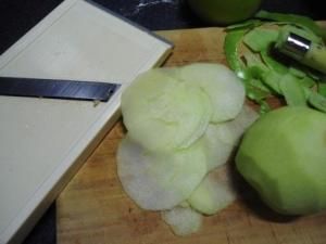 Lavar, pelar, retirar el corazón y cortar finamente las manzanas. Ir colocándolas en un tazón y si desean, le ponen un poco de jugo de limón recién exprimido para que no se oxiden.