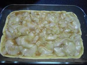 Retirar el molde del refrigerador, retirar el film y colocar las manzanas de modo que cubran todo. Si es que en el tazón de las manzanas quedó algún líquido, entonces lo agregan sobre las manzanas.