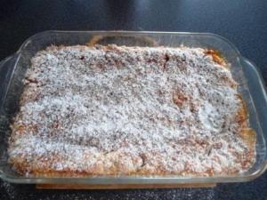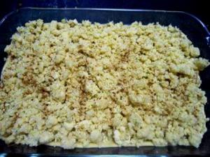 Retirar el crocante del refrigerador y colocarlo sobre las manzanas. Las manzanas deberán quedar totalmente cubiertas con este crocante. Si desean, espolvorear con un poco de canela en polvo.
