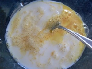 En otro tazón y con ayuda de un tenedor, mezclar los huevos con el buttermilk y la miel. Para el buttermilk lo que harán será colocar en la taza de medir una cucharada de vinagre blanco o jugo de limón, luego completan los 3/4 de taza con la leche fría y mezclan. La verdad es mejor si esto lo hacen antes, así le dan tiempo a la leche que se corte, hacen la mezcla y la ponen el refrigerador hasta que la necesiten. Ah, hay que retirar tres cucharadas del total del buttermilk, eso lo usarán después.