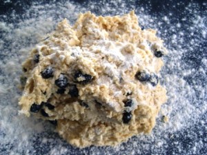Ahora colocar la masa sobre la mesa bien enharinada. Ojo, la masa es bien húmeda y pegajosa, así que necesitarán poner bastante harina. Ahora, con las manos dar una amasada con mucho amor, recuerden que están los blueberries. Lo que hay que hacer es tratar de unirla. No la amasen mucho porque entonces se calentará y la idea es que se mantenga fría.