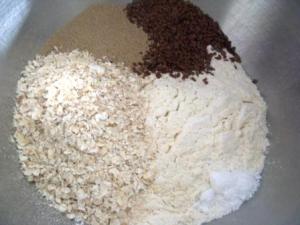 En el tazón de la batidora colocar 2 3/4 tazas de harina, avena, sal, levadura seca y las semillas de linaza y mezclar con la espátula.