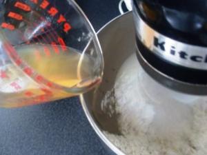 Poner en funcionamiento la batidora a velocidad baja y agregar en forma de chorro los ingredientes líquidos y batir por un minuto. Es mejor si la batidora tiene adaptado el batidor de paleta.