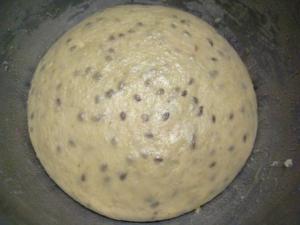 Colocar la masa en un tazón engrasado y engrasar un poco la superficie de la masa. Cubrir con film y dejar que la masa duplique su volumen. Yo dejé la mía como 1 1/2 hora dentro del horno apagado.