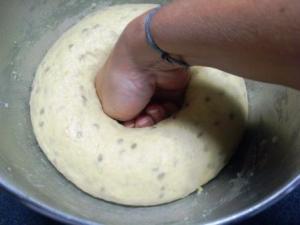 Pasado el tiempo, retirar el film y desgasificar la masa. En realidad basta con que retiren la masa del tazón y la coloquen en la mesa, pero me gusta aplastar la masa recién levada con el puño.