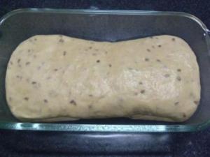 Colocar la masa en el molde engrasado y hacer una ligera presión de modo que la masa quede bien acomodada dentro del molde. Cubrir con film y dejar levar hasta duplicar su volumen. Yo lo dejé 1 1/2 hora dentro del horno apagado.
