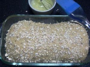 Pasado el tiempo, retirar el film y pincelar la masa con clara de huevo mezclada con agua. Luego espolvorear con avena.
