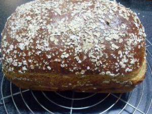 En fin, igual quería hacerle uno de avena y linaza, pero diferente, entonces revisé mi querido manual/recetario de la batidora y encontré la receta de un pan de miel y avena. Esa receta me llamó el ojo, no tenía linaza en su lista de ingredientes pero al ser una semilla pensé que se podría agregar sin interferir con la textura del pan. Y así fue, simplemente le puse un par de cucharadas y quedó maravilloso.