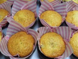 Repartir la masa en los moldes. Salen unos 15 muffins. Una sugerencia, y eso se lo comenté una vez a una de mis alumnas de las clases de cupcakes: cuando hacemos este tipo de masa con rellenos, suele suceder que los últimos muffins (o cupcakes) resultan con menos fruta, porque siempre al final ponemos lo que ha quedado de masa en los bordes y el fondo del tazón. Pues bien, para esos últimos muffins usen pirotines de otro color, así cuando ya estén listos sabrán cuáles tienen poco o nada de relleno.
