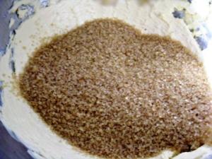 Añadir los huevos uno por uno, batiendo bien después de cada adición. Como la masa estará cortada, la verdad no hay mucho que batir, yo no logré que la masa se integre y quede cremosa luego de agregar los huevos, pero seguí adelante.