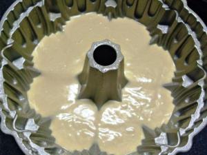 Ahora vamos al molde, el cual debe estar bien engrasado (yo prefiero usar grasa en spray para estos moldes). Agregar un tercio de la masa dentro del molde. Ah, el molde es de 10 tazas de capacidad.