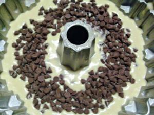 Colocar la mitad de las chispas de chocolate en medio del molde. Miren, yo usé las chispas que se consiguen en el mercado, pero pienso que mejor hubiera usado chocolate picado porque se derrite mejor, les recomiendo eso en vez de las chispas.