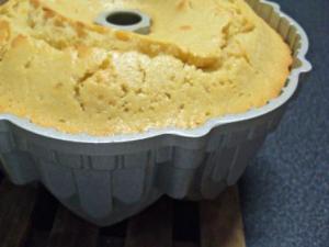 Con cuidado, sacudir ligeramente el molde para asegurarse que el queque se haya desprendido. Por favor, hacerlo muy suave, no queremos que el queque se rompa. Colocar la rejilla sobre el molde y con un movimiento rápido darle vuelta, de modo que la rejilla quede abajo y el molde arriba. Suavemente retirar el molde y listo…!!!