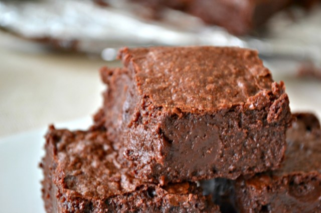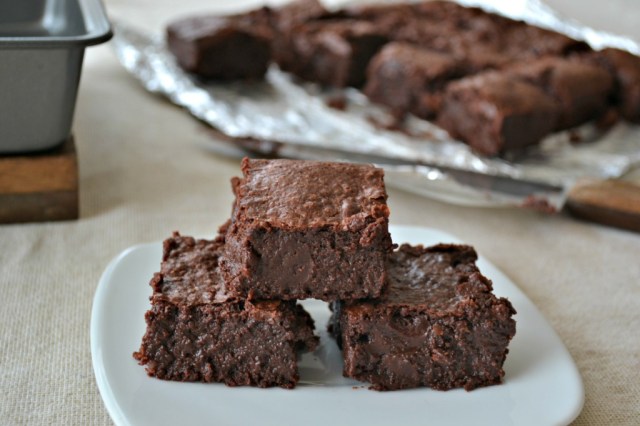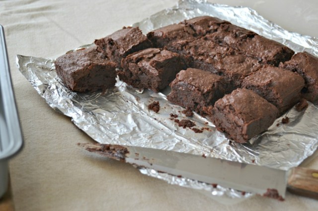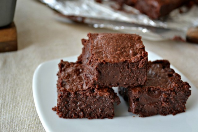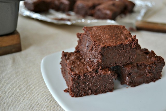 La receta original es de Martha Stewart y la única diferencia con la receta que hice hoy es que no le puse nueces, ni pecanas, ni nada por el estilo. Lo que sucede es que el brownie es uno de los pocos postres que mis hijos disfrutan hasta el final, pero no les gusta con «cositas», y ya que es de los pocos dulces que cuando hago se lo comen felices, tenía que hacerlo sin nada. Personalmente pienso que si se le pone pecanas tostadas a la masa, el resultado ya sería mucho más espectacular. Ustedes me contarán cuando lo hagan.