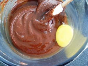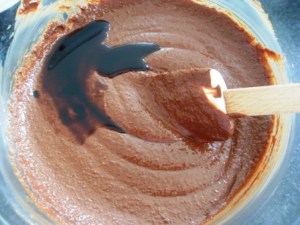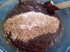 Cernir la fécula de maíz con la cocoa, canela y sal y agregarla a la masa. Mezclar bien con la espátula hasta que no queden rastros de los ingredientes secos. Si le van a poner pecanas, ahora es el momento.