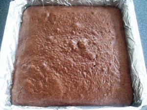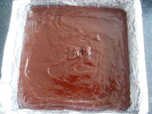 Vaciar la masa en un molde cuadrado de 8 pulgadas de lado. El molde puede estar engrasado y enharinado o forrado con papel platina. Yo prefiero forrarlo completamente con platina para que después me sea más fácil desmoldar y cortar. El papel platina va engrasado.