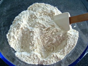 Vamos a preparar el queque. En un tazón grande mezclar las harinas, avena, azúcar, polvo de hornear, bicarbonato y sal.