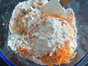 Agregar la zanahoria rallada a los ingredientes secos y mezclar hasta que la zanahoria quede cubierta.
