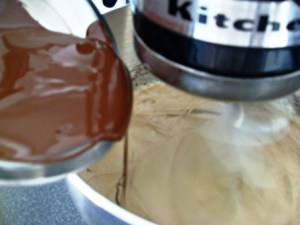 Añadir el chocolate derretido y frío y batir hasta que quede incorporado en la masa.