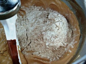 En un tazón cernir la harina junto con la gelatina, cocoa, polvo de hornear, bicarbonato y sal. Agregar esta mezcla al batido en tres tandas.