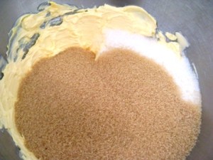 En el tazón de la batidora cremar la mantequilla con los dos tipos de azúcar. Deberán batir por 3 a 5 minutos a velocidad alta. Miren, para mí quedó un poco subido de dulce, pero a mi esposo le pareció el punto ideal. En la receta les pondré la cantidad real de azúcares, pero si les gustan los queques no muy dulces, entonces les recomiendo que disminuyan la cantidad de azúcar, ya sea de la blanca o de la rubia, o de ambas.