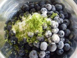 En otro tazón colocar los blueberries y mezclarlos con una cucharada de harina y la ralladura de limón. La harina evitará que los blueberries se vayan al fondo al momento de hornear.